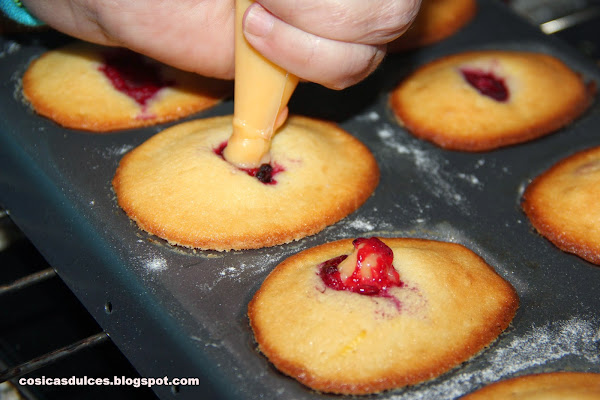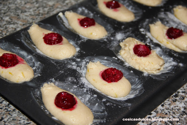 Dejamos reposar la masa en la nevera durante al menos 8 horas (este paso es muy importante). Una vez transcurrido este reposo ponemos la masa (que estará bien durita) en una manga pastelera y llenamos hasta la mitad las cavidades de nuestro molde de madeleines. Colocamos el el centro una frambuesa con la cavidad hacia arriba.