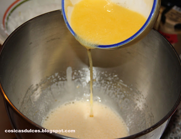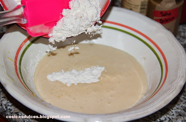 Cuando esté todo bien mezclado incorporamos en dos veces la harina tamizada junto con la levadura y mezclamos con movimientos suaves.