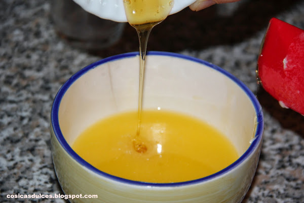 Comenzamos por derretir la mantequilla en el microondas. Una vez derretida la dejamos enfriar. Cuando esté completamente fría añadimos la leche y la miel y reservamos.