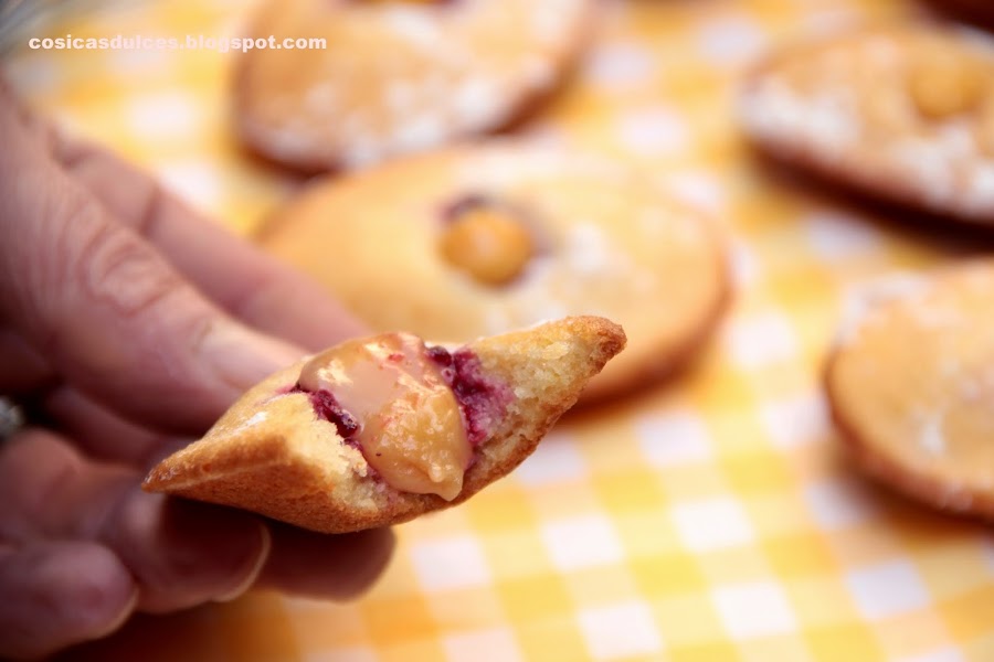 Horneamos a 180º grados unos 10 minutos o hasta que veamos que los filitos comienzan a tomar color (hay que cuidar que no se nos quemen). Una vez fuera del horno llenamos la cavidad de la frambuesa con el lemon curd. Yo usé uno muy rico de la marca Juker aunque también podéis ver la forma de prepararlo AQUÍ.
