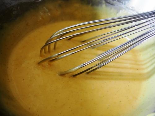 La mantequilla ya esta derretida y es importante que no esté demasiado caliente. Vertemos y revolvemos cuidadosamente, hasta su completa incorporación.