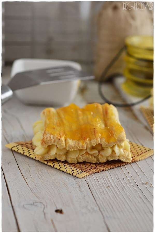 Para realizarlo hice la forma de un acordeón con la masa de hojaldre, como se muestra en este vídeo y lo lleve al horno por 20 minutos a 180 grados con calor arriba y abajo rellene con el sweet merengue buttercream, tape con otra tapa y esparcí mermelada de albaricoque por encima