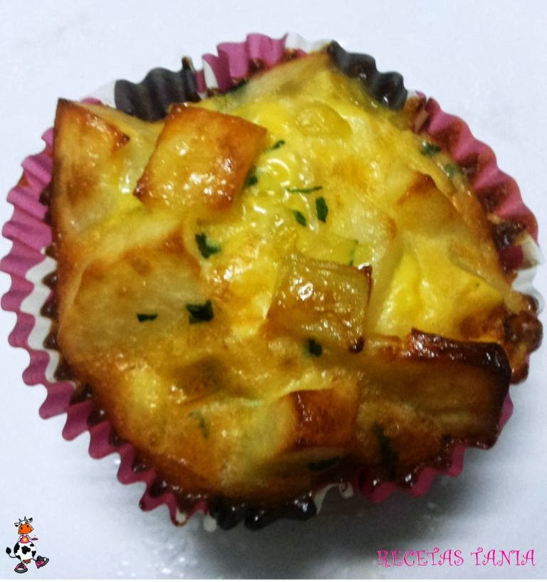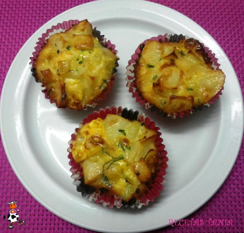 Pelamos,lavamos, cortamos las papas en cuadritos y las freímos En un bol batimos los huevos y le ponemos un poquito de sal y perejil picado,una vez estén fritas las papas las añadimos al bol donde están los huevos y sofreímos la cebolla.Cuando la cebolla esté pochadita la añadimos al bol con las papas,los huevos y el perejil,mezclamos todo bien. Colocamos los papelitos de magadlenas en los moldes de silicona y rellenamos,metemos al horno unos 15-20min (depende del horno) y listos para comer....