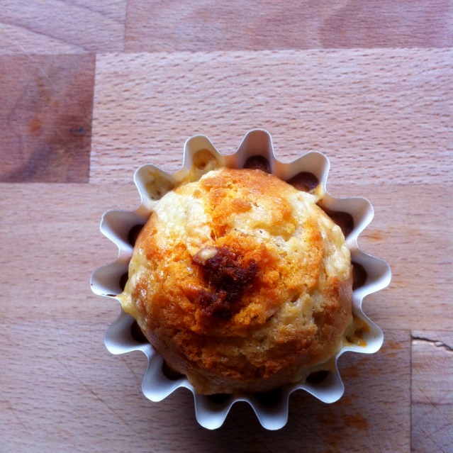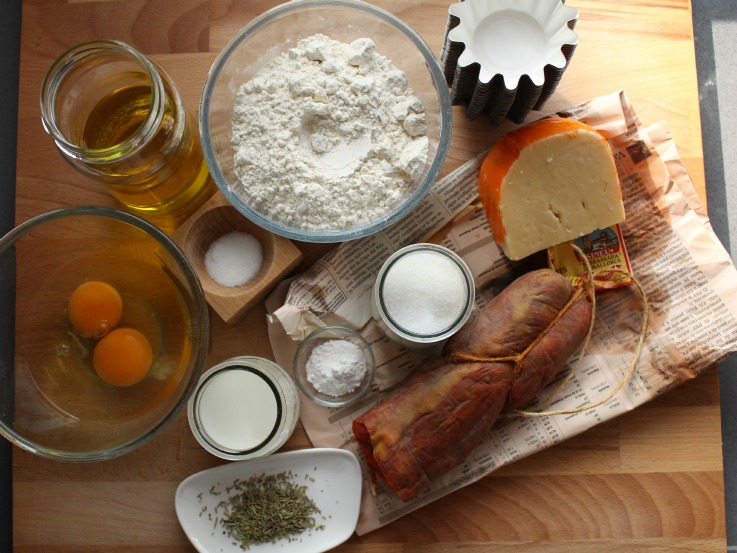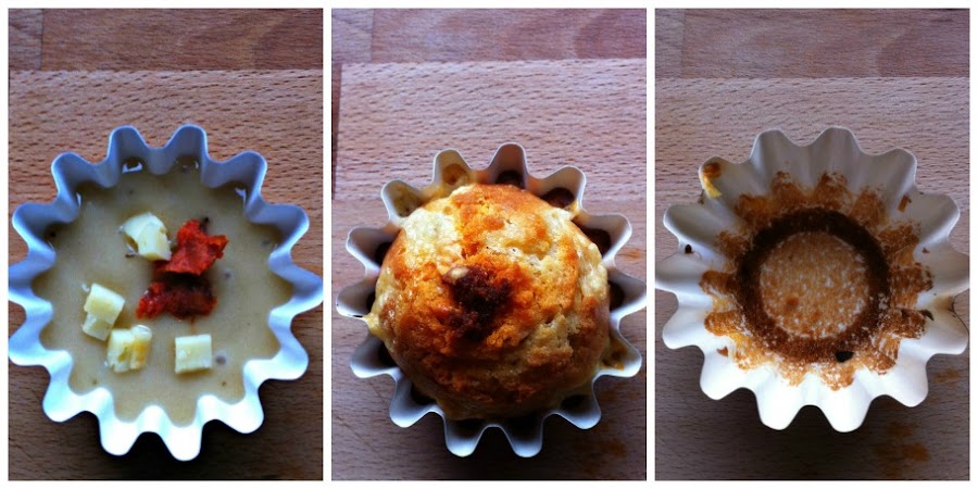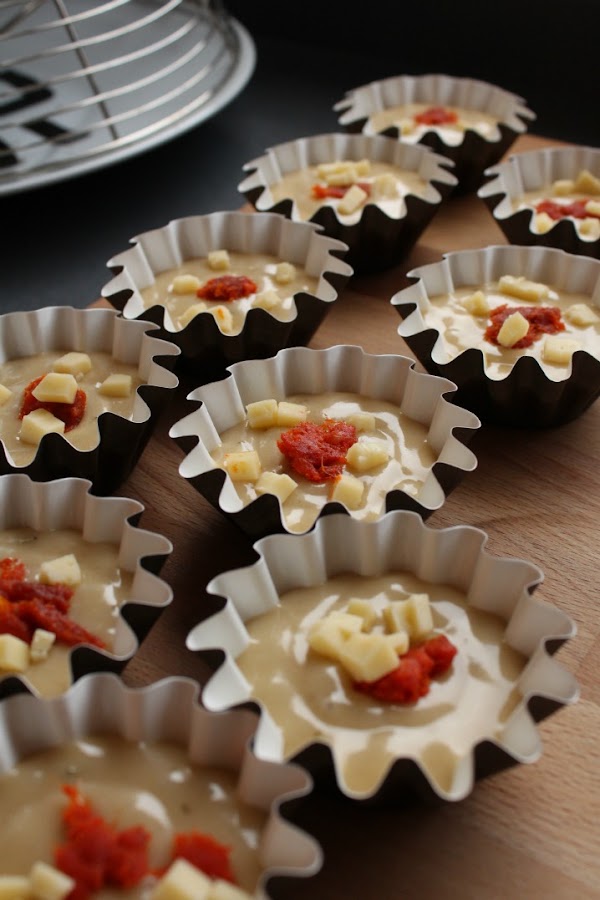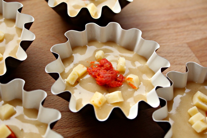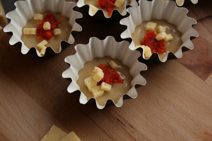 Antes de hornear, coloca encima de cada magdalena, otro trozo de queso y sobrasada.