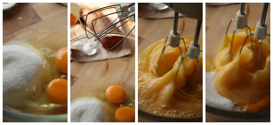 Con las varillas eléctricas, velocidad alta, mezclamos los huevos y el azúcar.