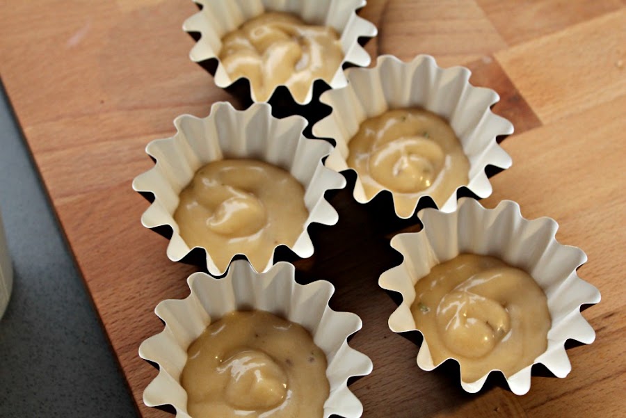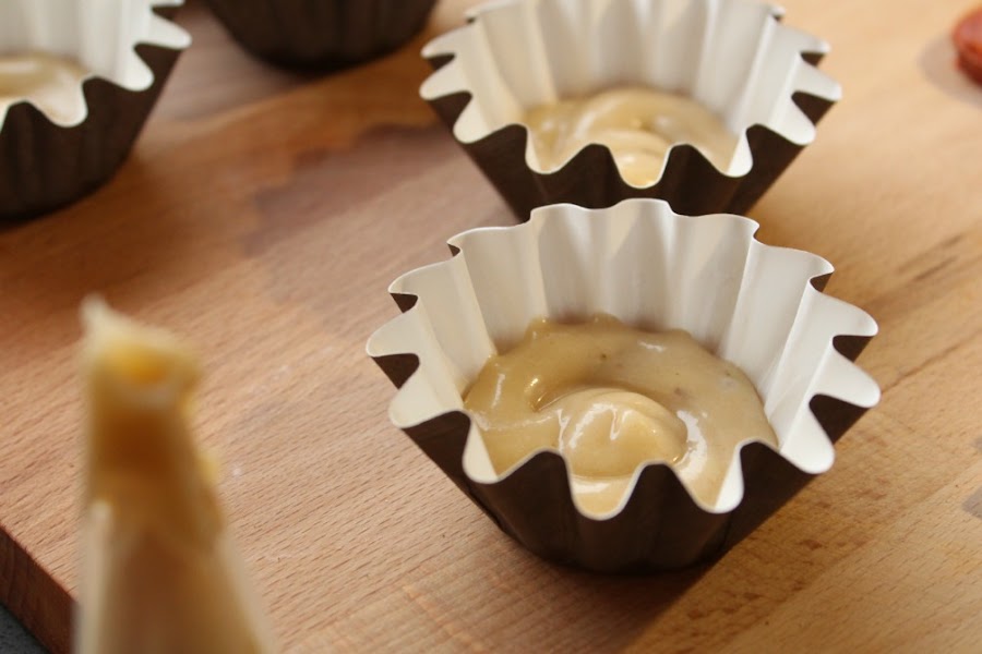 Colocamos la masa en una manga pastelera y llenamos los moldes hasta la mitad de su capacidad.