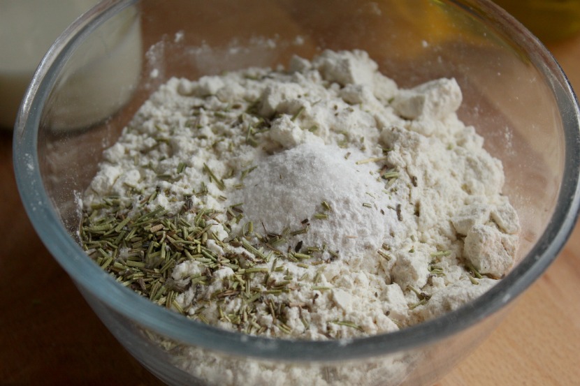 Mezclaremos aparte la harina con el impulsor, la sal y el romero.
