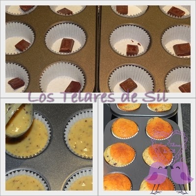 Coloca en un molde de magdalenas los papelitos y un trozo de chocolate en cada uno de ellos.