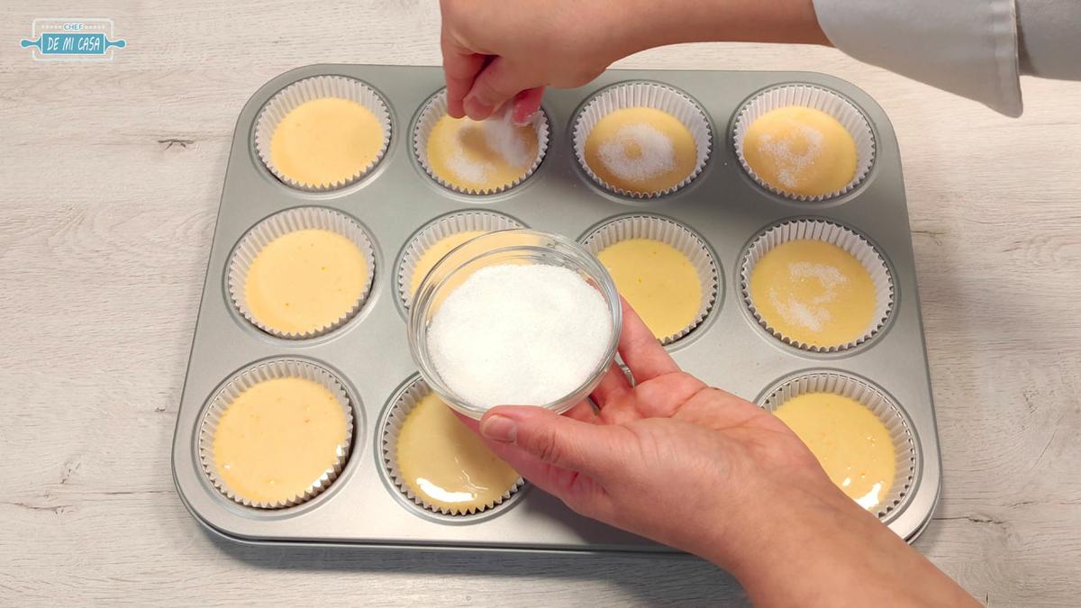 Una vez llenas todas las cápsulas, solamente nos queda espolvorear un poquito de azúcar por encima de todas las magdalenas, para que nos quede esa capa crocante.