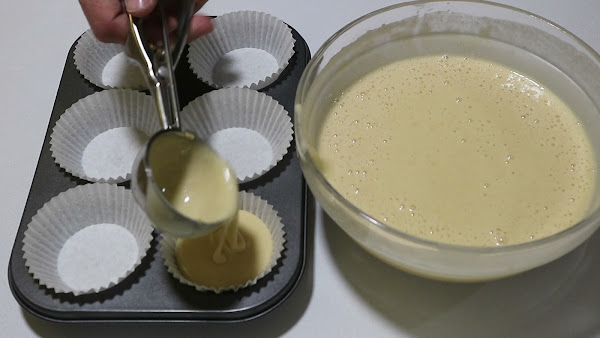 8. A continuación vamos a preparar la bandeja con los moldes para las magdalenas. Rellenamos los moldes solo hasta los 3/4 partes, no lo rellenamos entero ya que se pos saldría por todas partes.
