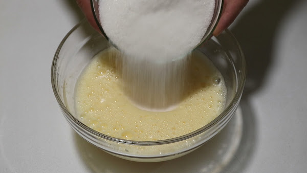 2. Cuando esten bien batidos añadimos el azucar y seguimos batiendo.
