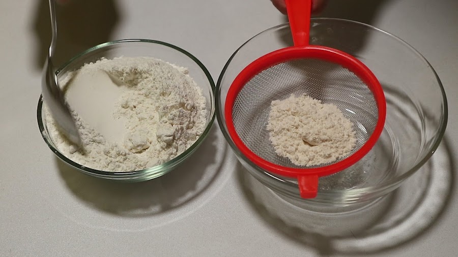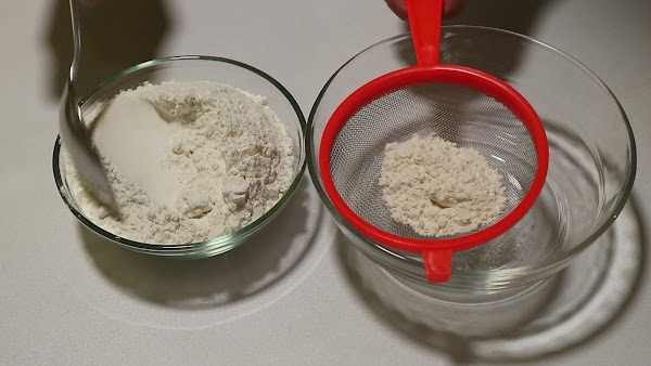 4. Una vez mezclado todo vamos a tamizar la harina, de este modo las magdalenas nos quedarán super esponjosas.