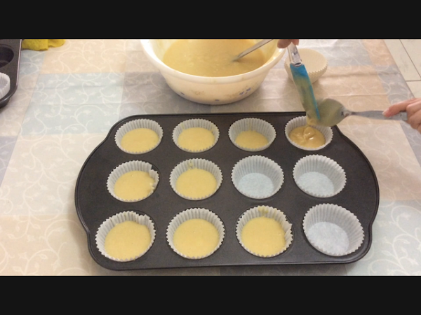 d) Pondremos la masa en los moldes de papel ayudándonos con una cuchara, jarra o bien con una manga pastelera, rellenando hasta la mitad del molde aproximadamente, podemos poner un poco de azúcar por encima.