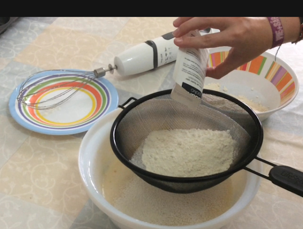 c) Luego ponemos un colador y añadimos la harina y la levadura y tamizamos para agregar a la mezcla.. Volvemos a mezclar muy bien y añadimos la ralladura de limón (opcional); aunque para que nos suban un poco más podemos ponerle un poco de bicarbonato sodico. Todo deber quedar bien mezclado.