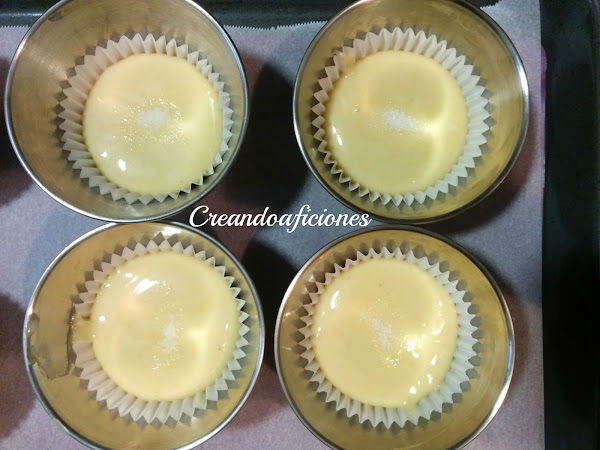 Ponemos las cápsulas de papel en las flaneras, si tenéis. Las llenamos hasta tres cuartas partes y echamos una pizca de azúcar en el centro de la mezcla.