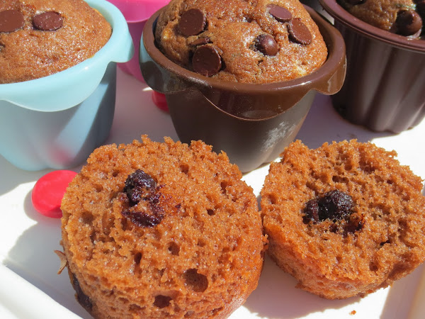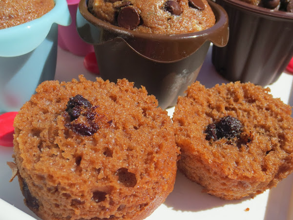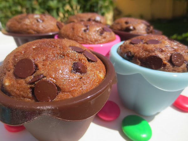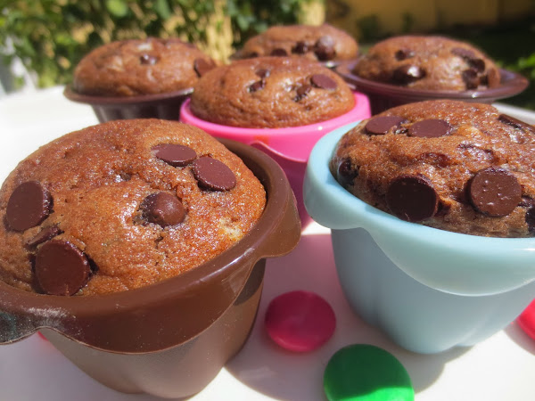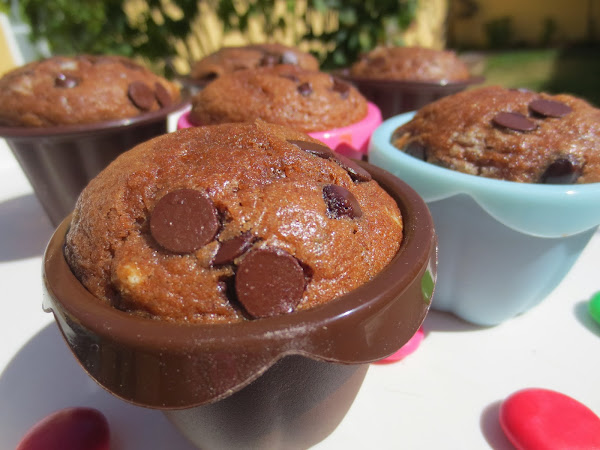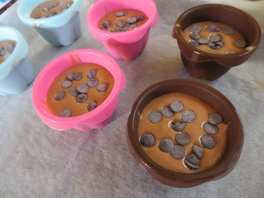 5- Con la Ka en velocidad 1, ir echando la mezcla de harina a cucharadas. Terminar de envolver y llenar cápsulas 3/4 partes. Poner un puñado de gotas de chocolate en cada una.