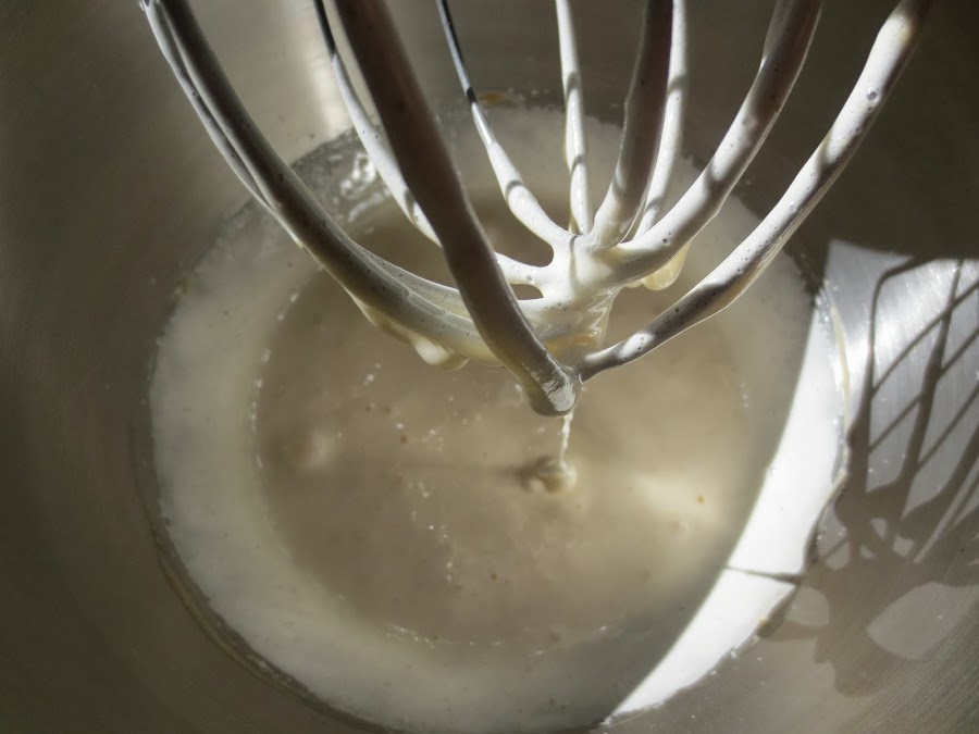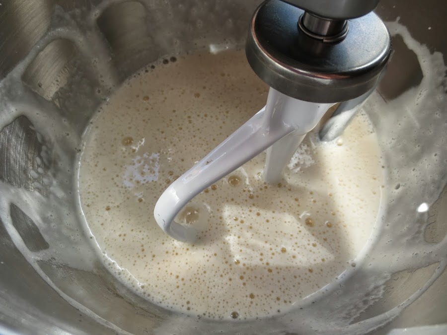 4- Cambiar la varilla por la pala mezcladora , añadir la leche, aceite y vainilla y mezclar unos 10 segundos a velocidad 1.