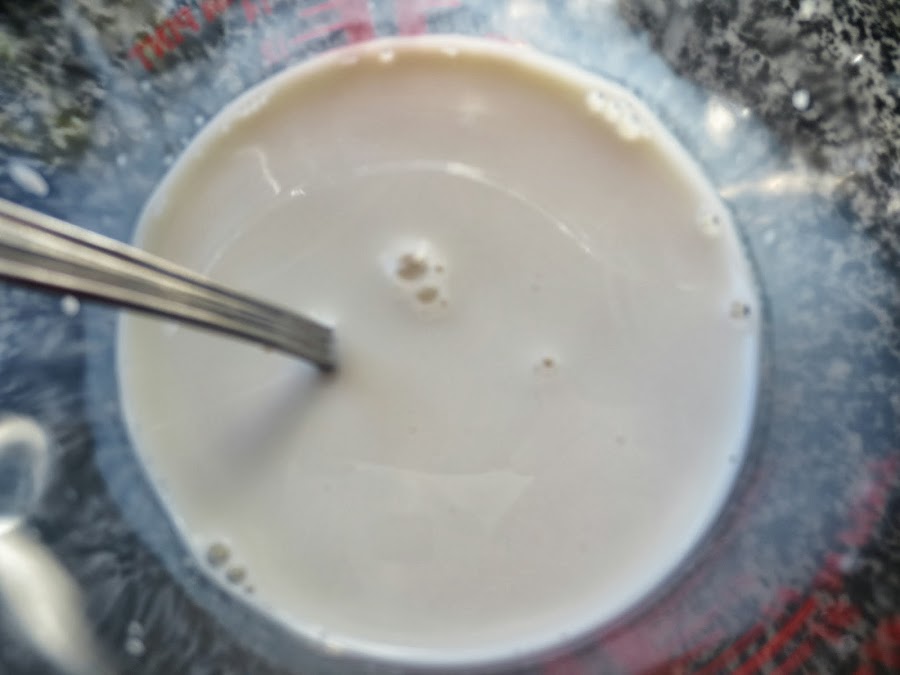 1- Disolver el vinagre o zumo en la leche mezclando bien, dejar reposar unos 10 minutos para que se corte la leche . (Buttermilk). Reservar.
