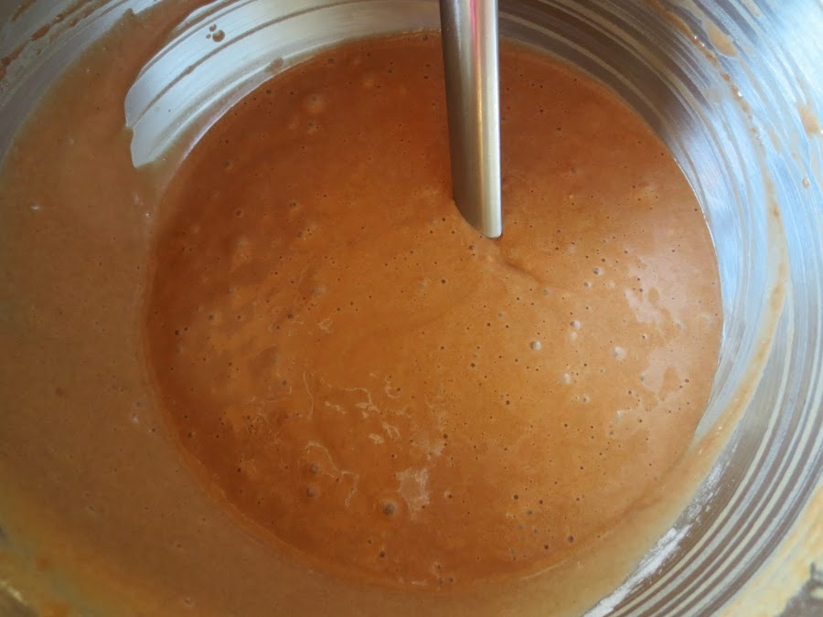Y con la pala mezcladora, la mezcla de harina poco a poco, así queda más suave y sin grumitos