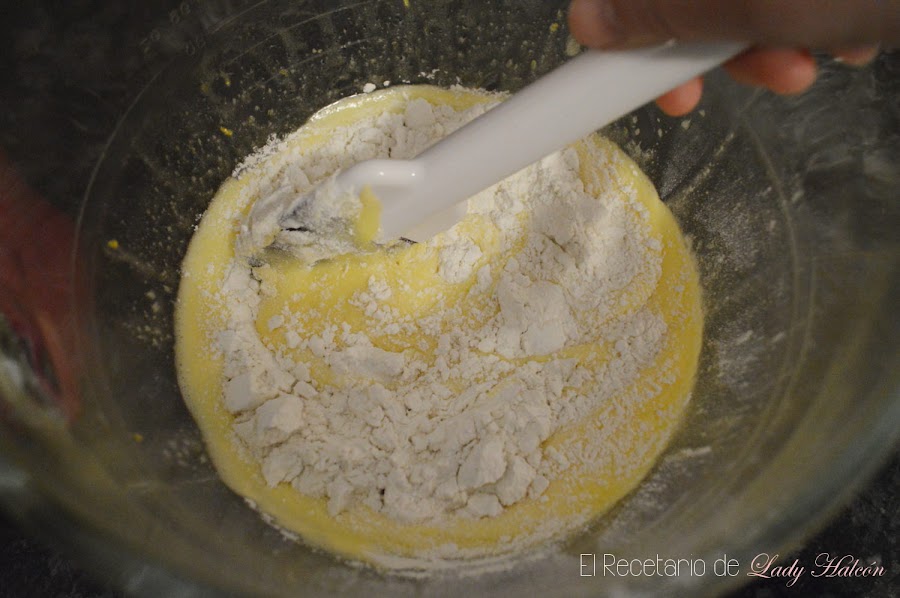 Sobre el bol de la masa añade la harina y la levadura tamizadas y mézclalo con movimientos envolventes utilizando una espátula o lengua.