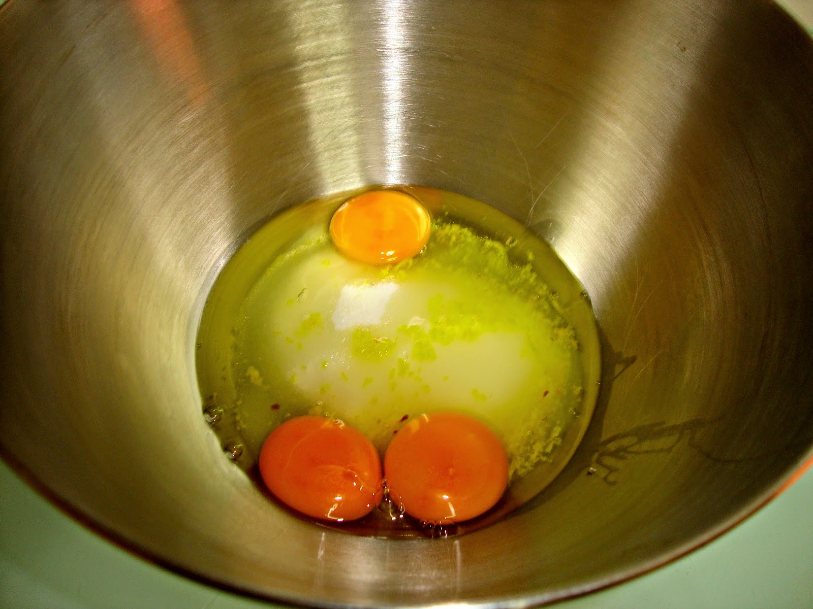 En un bol ponemos los huevos con el azúcar y la ralladura de limón y batimos con las varillas hasta que quede espumoso y aumente su volumen.