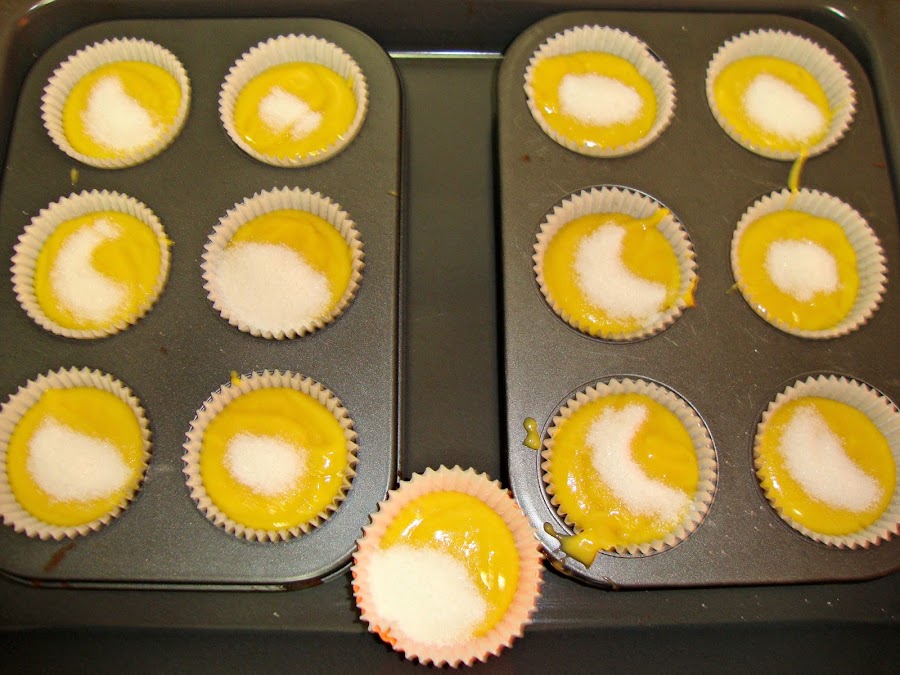 Repartimos la masa en las cápsulas de las magdalenas y le añadimos un poquito de azúcar por encima. Metemos en el horno caliente a 200ºC durante unos 18 minutos.