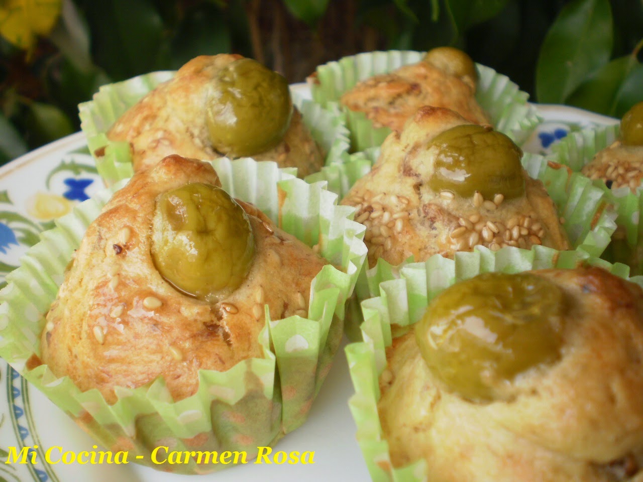 Cortar las aceitunas en trozos pequeños, dejando una para cada magdalena para decorar.