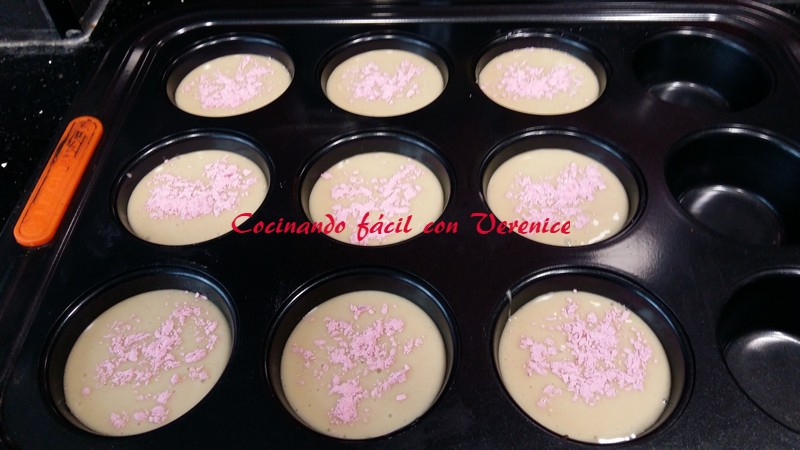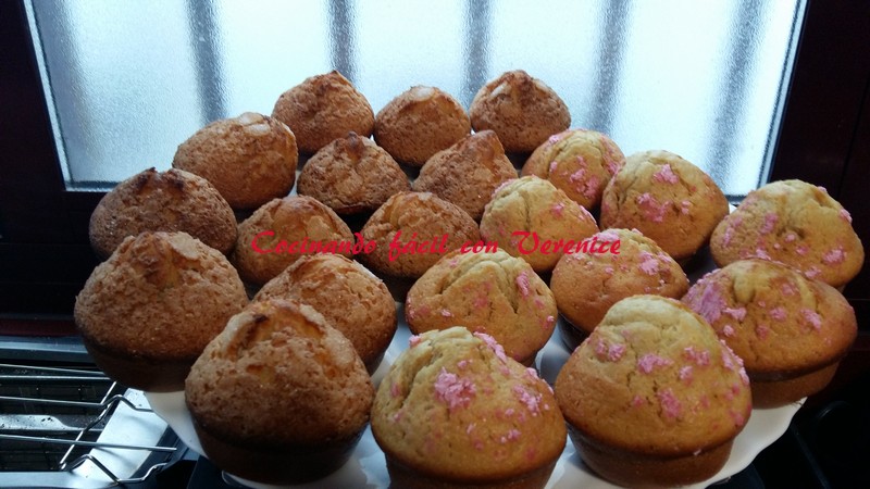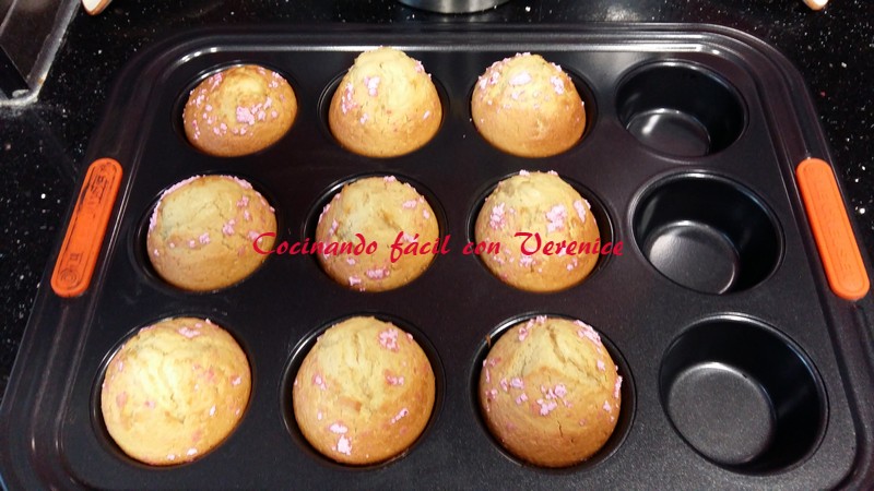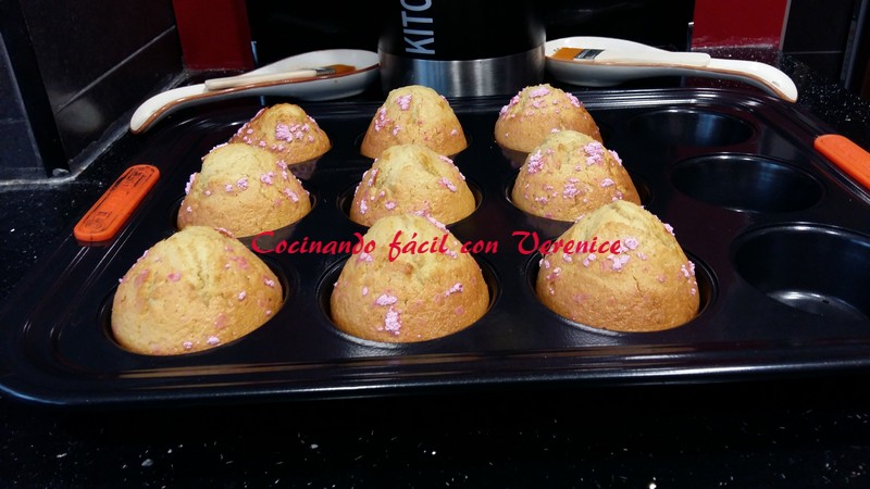 En esa tanda salieron 12 magdalenas, en la segunda 9, puede que en ésta llenara un poco más los moldes, pero no han variado en nada de textura ni esponjosidad. A ésta tanda le puse por encima azúcar glass de color rosa, la compré así.