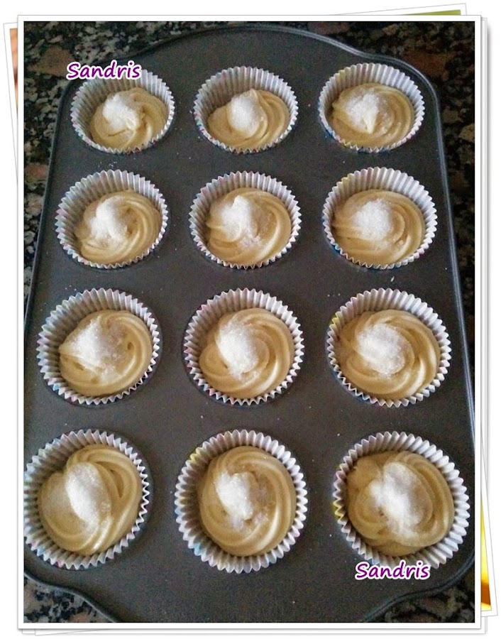 Y nada más, una vez esté ya todo bien mezclaro, lo ponemos en nuestros moldes para magdalenas, que cubran un poco más de la mitad del molde; por encima le espolvoreamos un poco de azúcar y al horno a unos 175ºC unos 25-30 minutos, aunque el mío le costó un poco más, depende del horno que tengáis, claro.