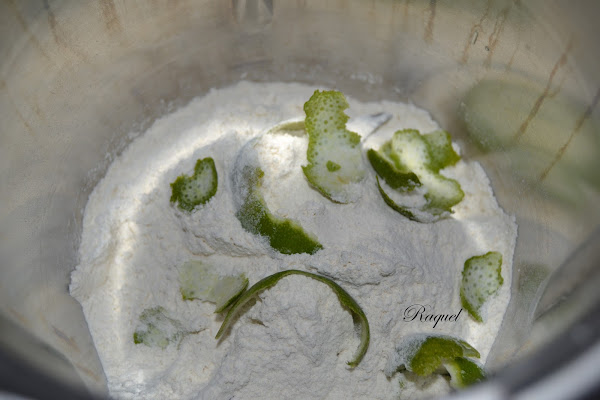 Mete la harina en el vaso con la piel de la lima, pulveriza 15 segundos a velocidad de 5 a 10, reserva en un bol.