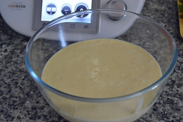 Mete en el vaso los huevos, el azúcar, el aceite, el zumo de la lima y el coco hidratado en la leche, programa 20 segundos a velocidad 3 y medio.