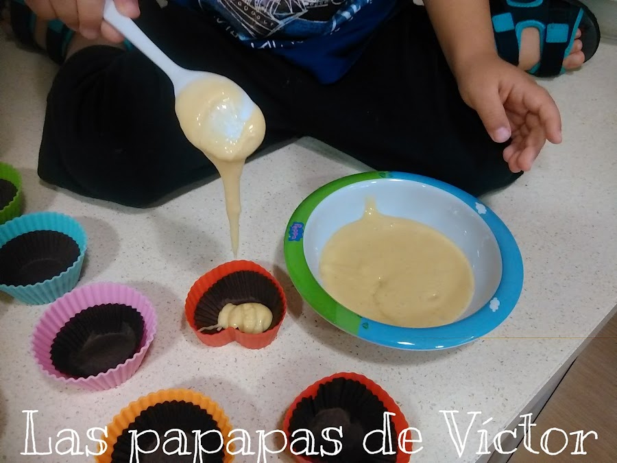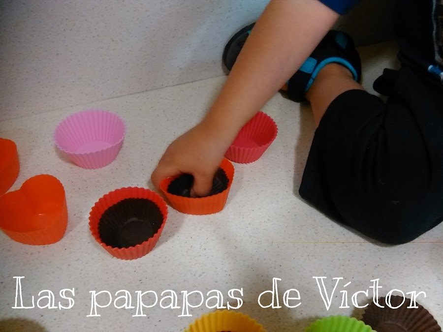 Para que no se peguen en los moldes de silicona , nosotros colocamos encima los moldes de papel