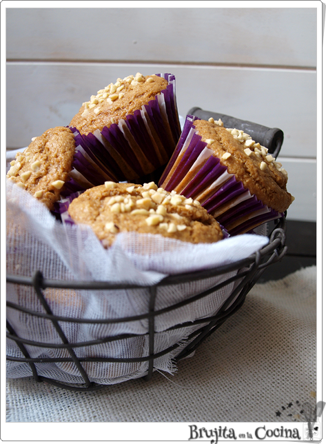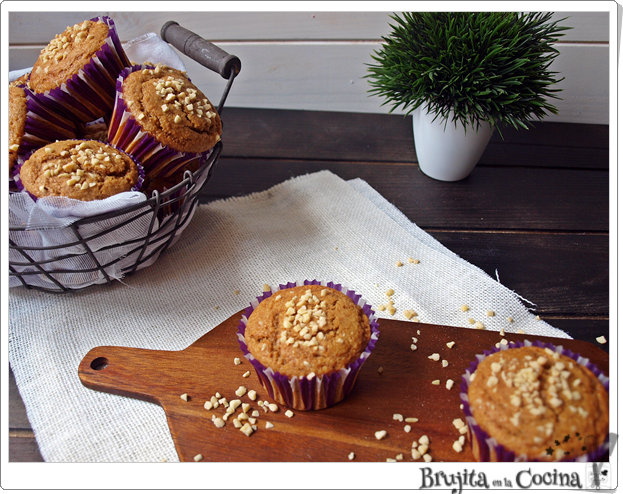 Una vez que tenemos la masa lista vertemos en las cápsulas para magdalena que tenemos en base rígida. Espolvoreamos unos cubitos de almendra e introducimos en el horno precalentado a150ºC durante 30 minutos.