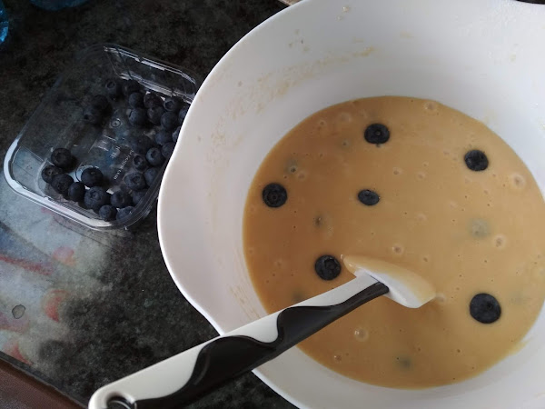 Cuando tenemos la masa lisa, sin grumos ponemos la mitad de los arándanos y removemos con cuidado.