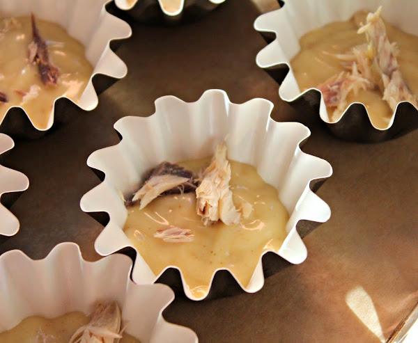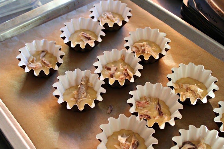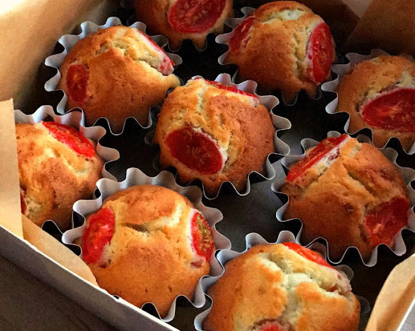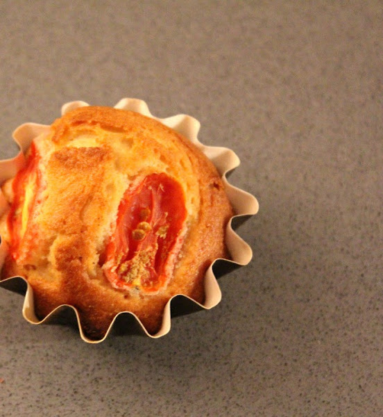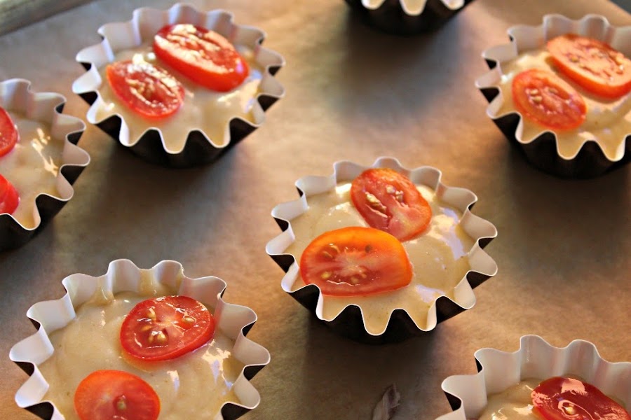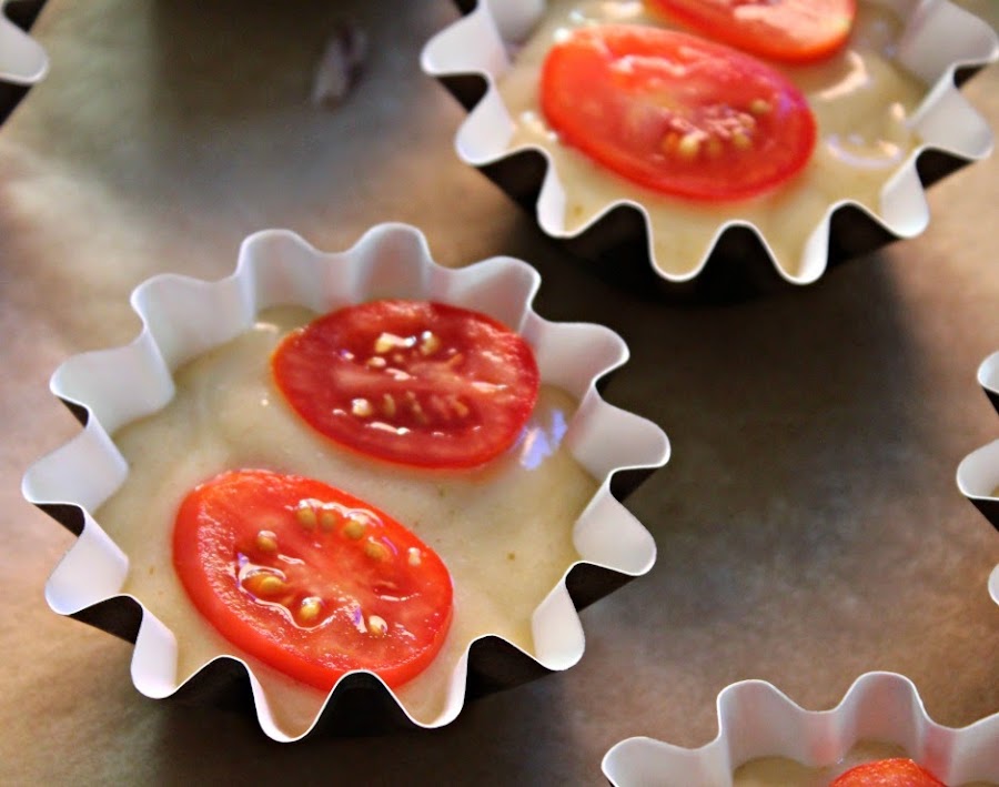 Antes de hornear, colocamos encima de cada magdalena, unas rodajas de tomate.