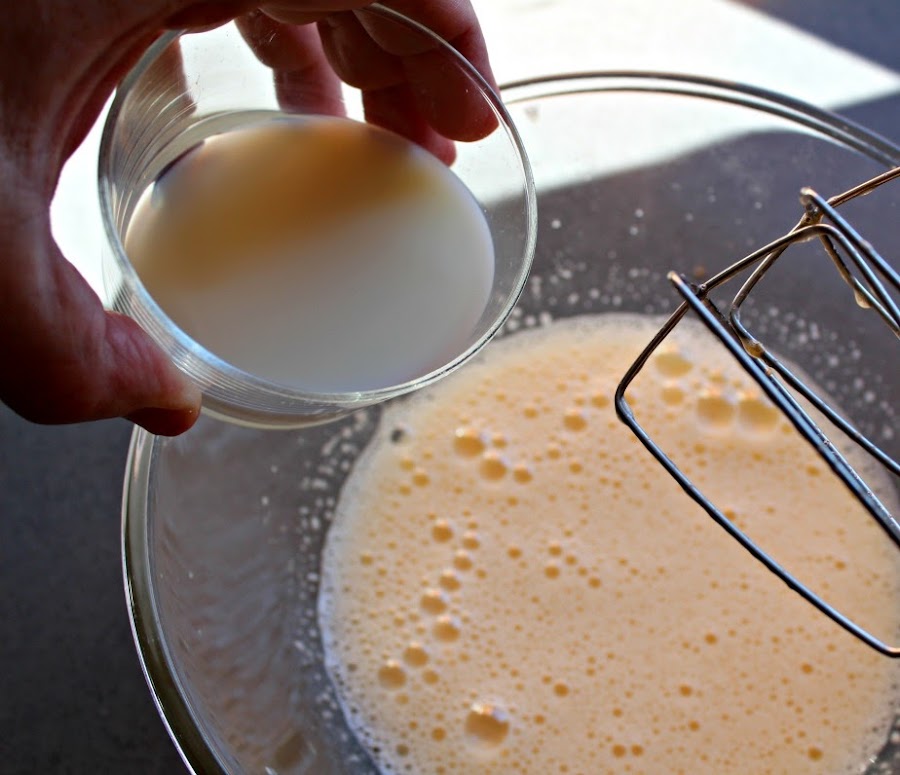 Una vez bien mezclado, añadiremos esto a la mezcla de huevos; también en marcha lenta.