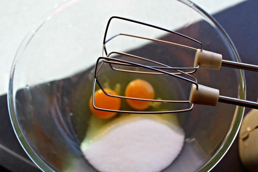 Con las varillas eléctricas, velocidad alta, mezclamos los huevos y el azúcar.
