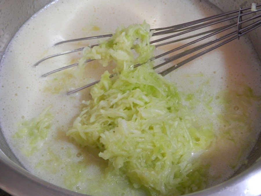 Pela y ralla el calabacín en el corte fino del rallador. Añade a la mezcla.
