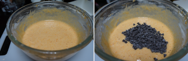 Seguido añadimos un puñado de pepitas de chocolate a la masa, mezclamos. Reservamos unas pocas de pepitas.
