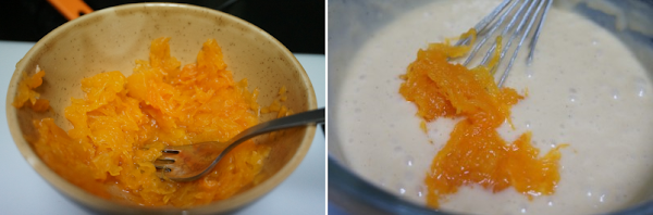 Chafamos la calabaza o la trituramos, la iremos añadiendo a la masa, se puede triturar dentro con la masa o batir la masa con todo junto.