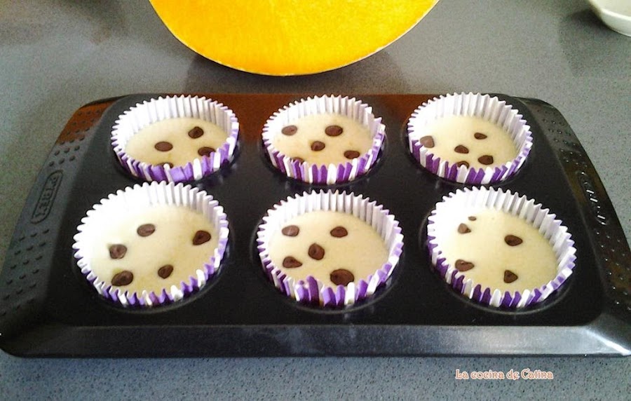 Mezclar en un bol los huevos y el azúcar, batirlo bien hasta que se vea que el azúcar está perfectamente mezclado. Añadimos la leche, el aceite, la calabaza triturada y la ralladura de la naranja, seguimos batiendo. Aparte mezclar la harina con la maicena y el sobre de levadura y sin dejar de batir lo vamos añadiendo poco a poco a la mezcla anterior. Llenamos los moldes con la masa hasta 2/3, le echamos las pepitas de chocolate por encima (si no ponemos las pepitas espolvoreamos con azúcar). Metemos al horno a 180 grados durante 20 minutos.