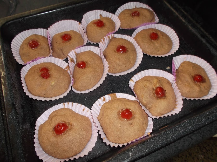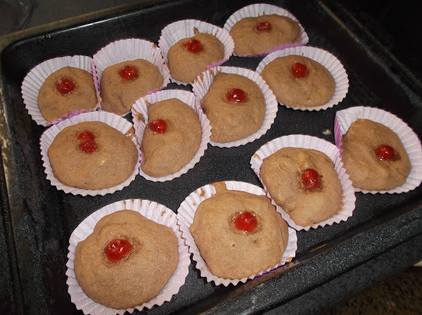 Sobre cada magdalena le colocamos media cereza confitada.