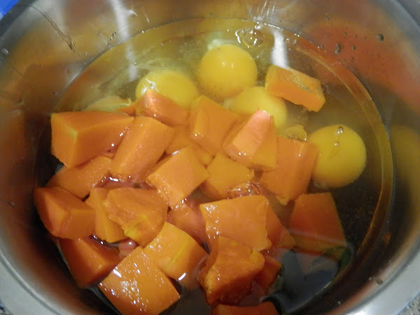 En un bol, añadimos la calabaza asada ya fría, agrega el azúcar, los huevos y el aceite.