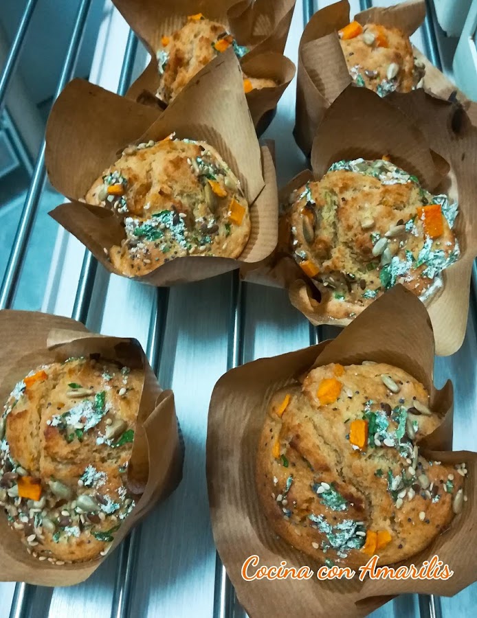 paso 4.- Ahora que tenemos todo listo solo tenemos que mezclar bien las dos mezclas anteriores y la calabaza verter en los moldes tratando de no manchar mucho los papelitos, rocear por encima pipas de calabaza, el romero fresco y un poquito de harina lo que nos ha sobrado de la mezcla de las dos harina .