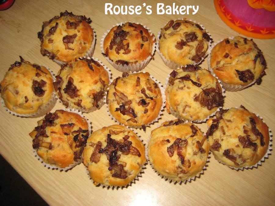 Repartimos la mezcla en los moldes, repartimos la cebolla que reservamos para la decoracion por encima de las magdalenas y las horneamos turante 20 minutos aproximadamente.