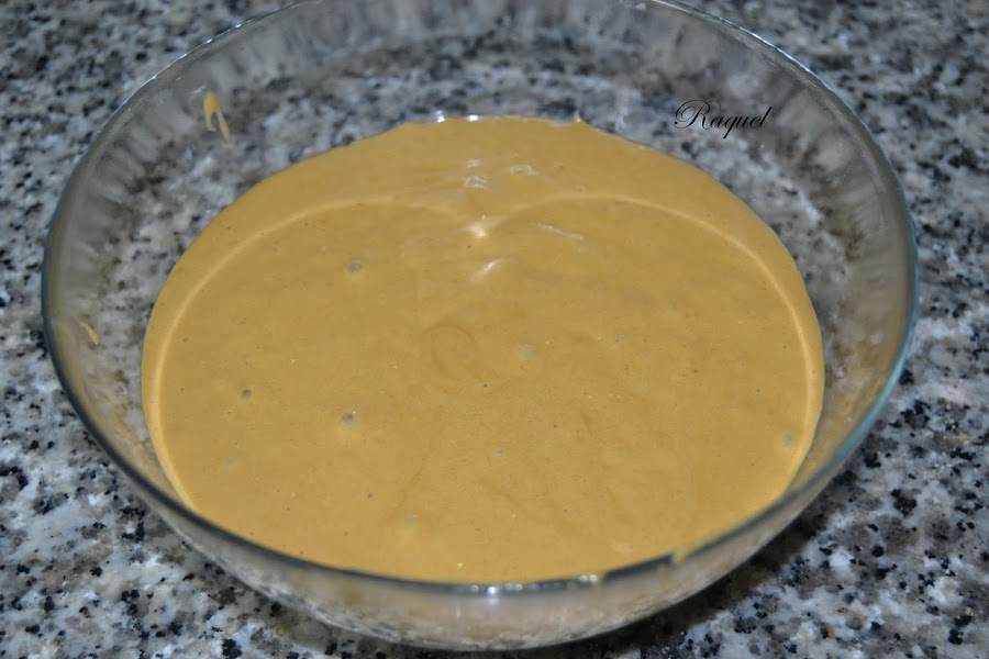 Preparación de la masa:Bate en un bol los huevos y el azúcar moreno durante unos minutos hasta que quede una mezcla cremosa.