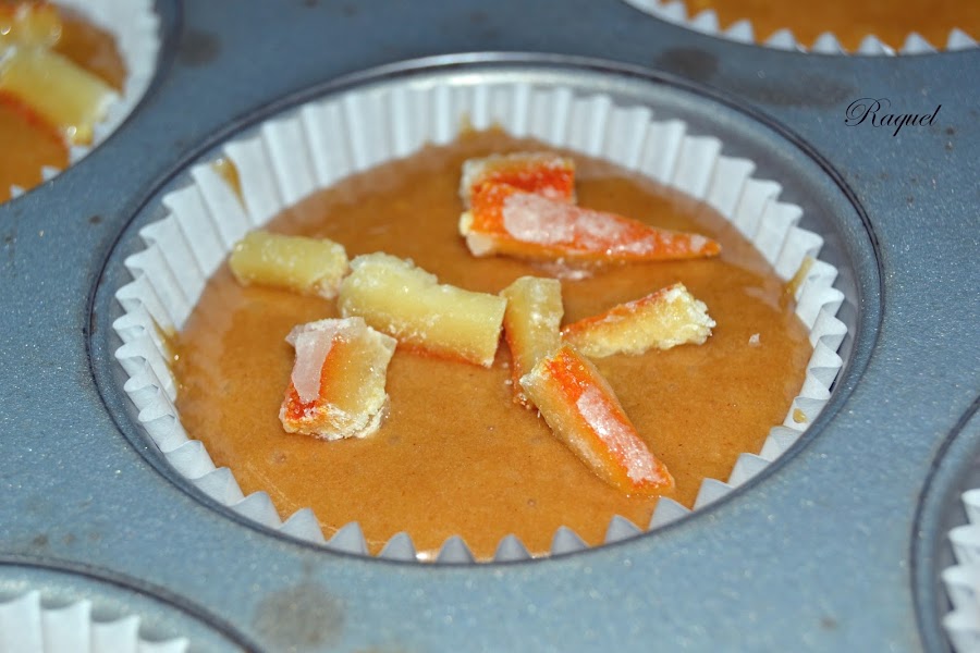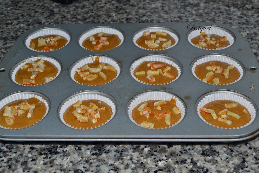 Hoy sin saber muy bien de que hacerlas he tirado de lo que hubiese por casa, para darle salida por ejemplo a una pieles de naranja confitadas que hice después de reyes y termine de gastar la harina de centeno que tenia en un armario y por ultimo utilizar el azúcar moreno que me quedaba en el bote, por lo demás tenia ingredientes suficientes para hacer estas ricas magdalenas y me lié con ellas.