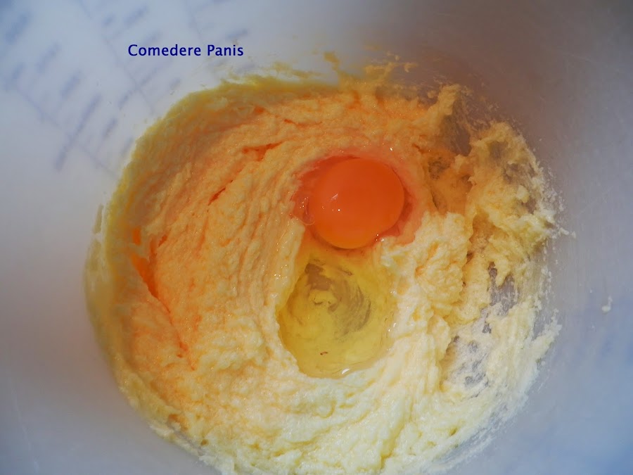 Bate la mantequilla con el azúcar hasta obtener una crema, luego añade un huevo y bate cuando, esté bien mezclado añade el otro huevo y bate.
