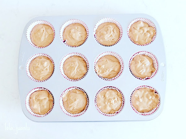 Repartimos la mezcla entre las cápsulas de cupcakes con ayuda de una cuchara de servir helado. Tenemos que tener en cuenta que las llenaremos hasta 2/3 de su capacidad.