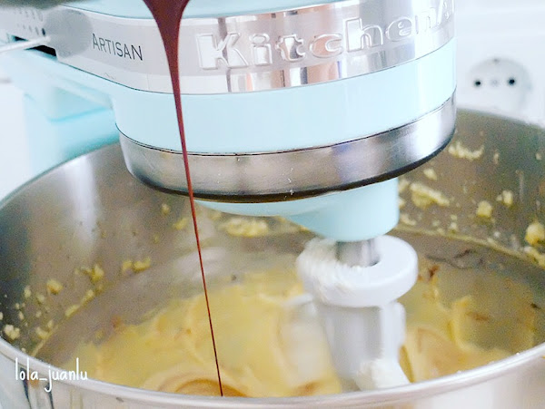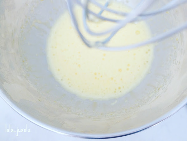 Cascamos los huevos y los echamos en un bol, los batimos con unas varillas hasta que estén espumosos. Añadimos a la mezcla anterior y mezclamos hasta que queden integrados.